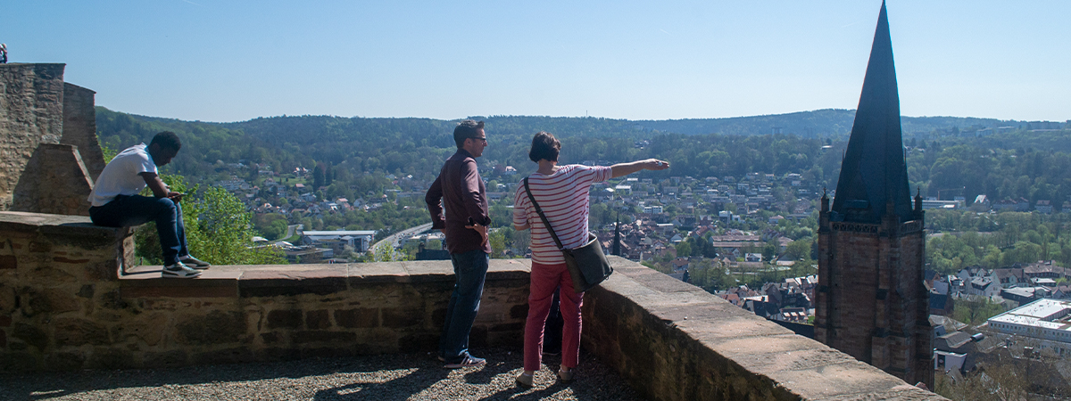 Stejle gader og trapper fører mod toppen, hvor slottet Landgrafenschloss venter sammen med 1500-tals-kollegiet Collegium Philippinum.
